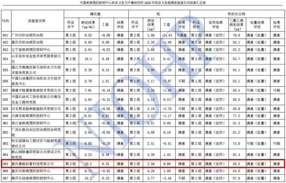 2020年3月,我公司參加了由中國疾病預(yù)防控制中心職業(yè)衛(wèi)生與中毒控制所組織的全國職業(yè)衛(wèi)生檢測實驗室比對,參加項目為吸收液中磷化氫定量檢測、濾膜中鉈定量檢測、活性碳管中有機(jī)化合物(苯、環(huán)己烷、三氯乙烯、乙苯)定性定量檢測,結(jié)果均為滿意。