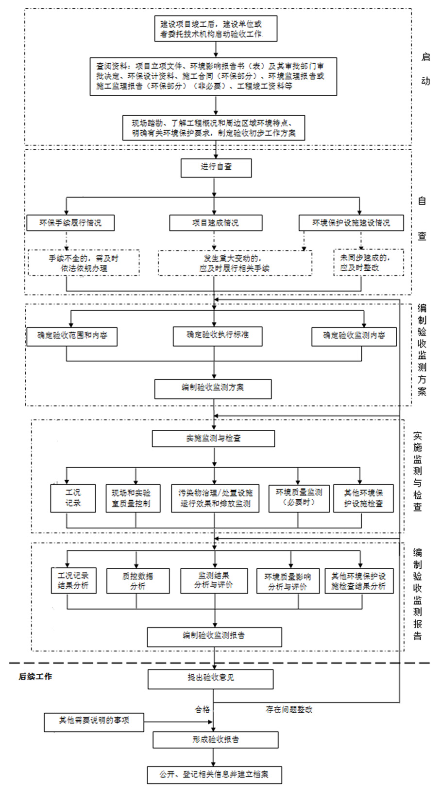 驗收工作主要包括驗收監(jiān)測工作和后續(xù)工作,其中驗收監(jiān)測工作可分為啟動、自查、編制驗收監(jiān)測方案、實施監(jiān)測與檢查、編制驗收監(jiān)測報告五個階段。具體工作程序見圖1。