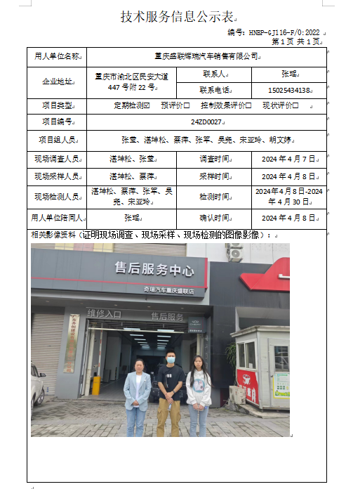 重慶盛聯(lián)輝瑞汽車銷售有限公司定期檢測項目公示