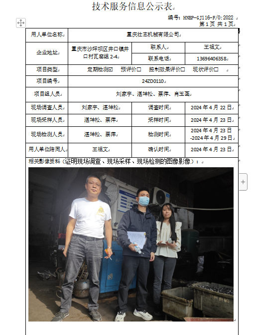 重慶壯志機(jī)械有限公司定期檢測項(xiàng)目公示