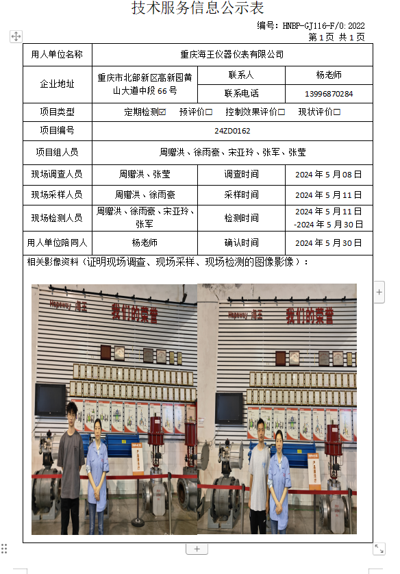 重慶海王儀器儀表有限公司定期檢測項目公示