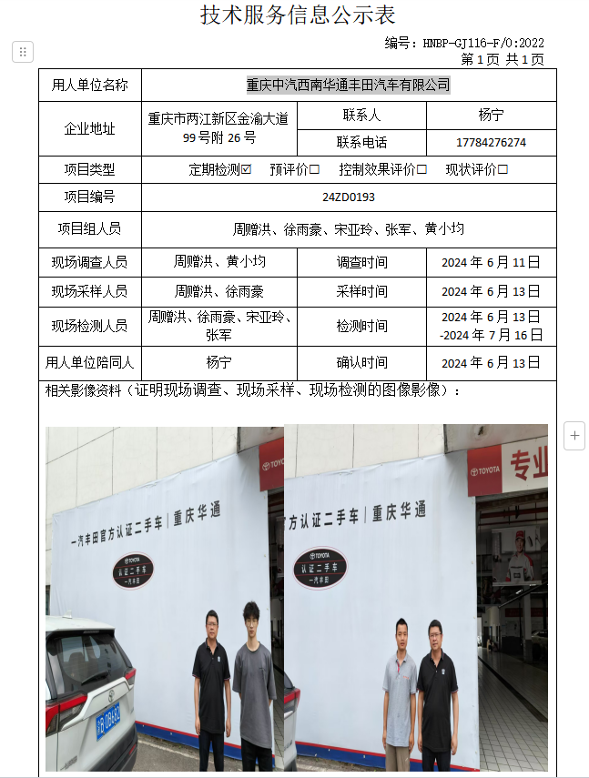 重慶中汽西南華通豐田汽車有限公司定期檢測項目公示