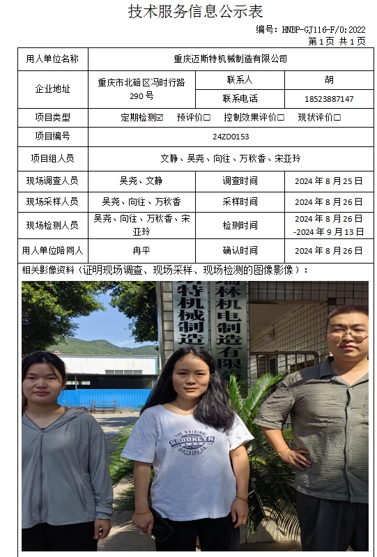 重慶邁斯特機(jī)械制造有限公司定期檢測項(xiàng)目公示