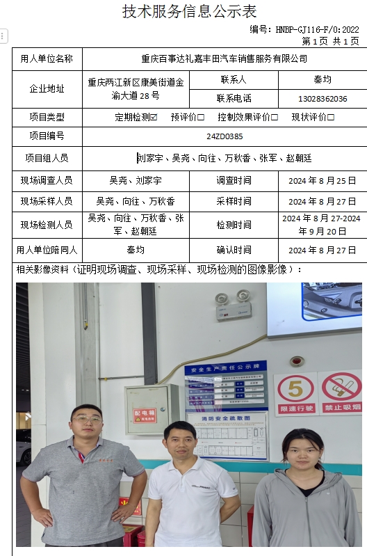 重慶百事達(dá)禮嘉豐田汽車銷售服務(wù)有限公司定期檢測項目公示