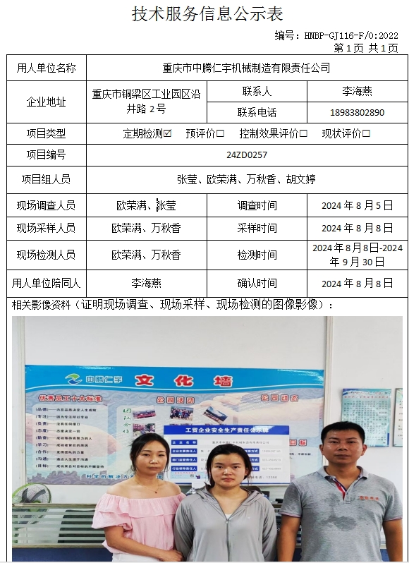 重慶市中騰仁宇機(jī)械制造有限責(zé)任公司定期檢測(cè)項(xiàng)目公示