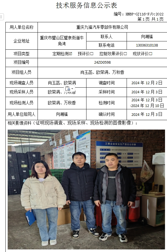 重慶九福汽車零部件有限公司定期檢測項目公示