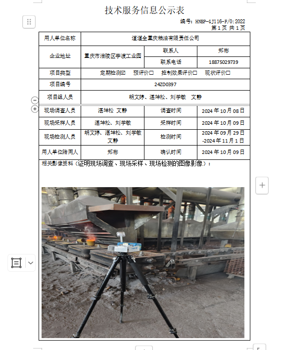 道道全重慶糧油有限責(zé)任公司職業(yè)衛(wèi)生檢測(cè)項(xiàng)目公示