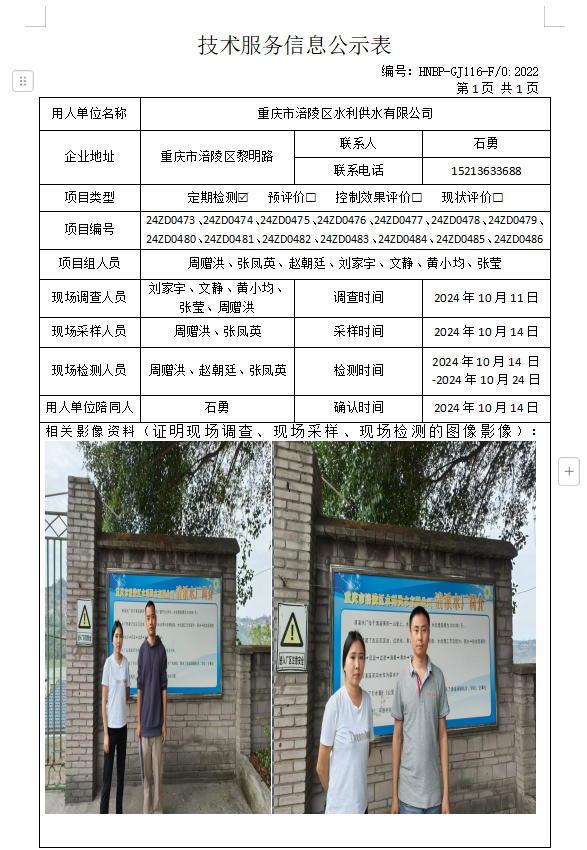 重慶市涪陵區(qū)水利供水有限公司焦石水廠定期檢測項(xiàng)目公示