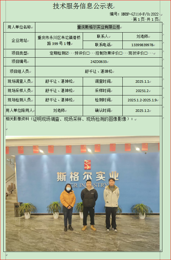 重慶斯格爾實業(yè)有限公司定期檢測項目公示