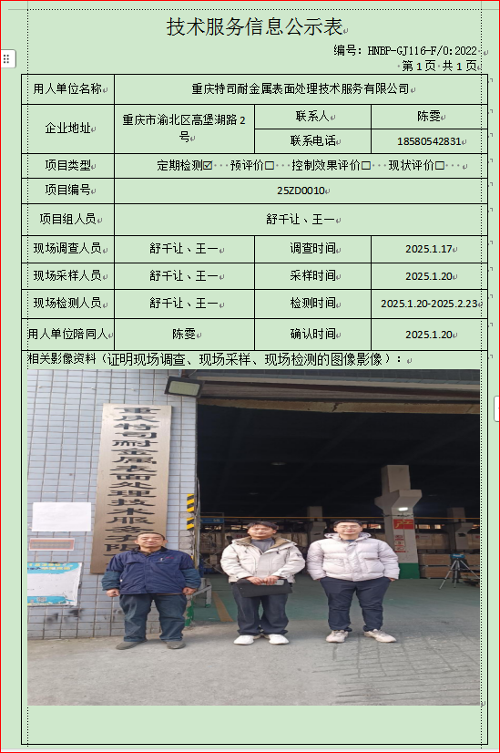 重慶特司耐金屬表面處理技術(shù)服務(wù)有限公司定期檢測(cè)項(xiàng)目公示