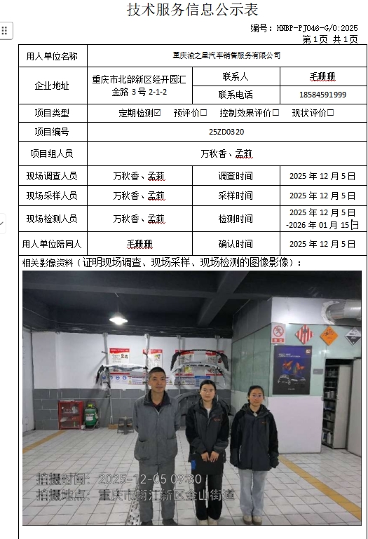 重慶渝之星汽車銷售服務(wù)有限公司定期檢測項目公示
